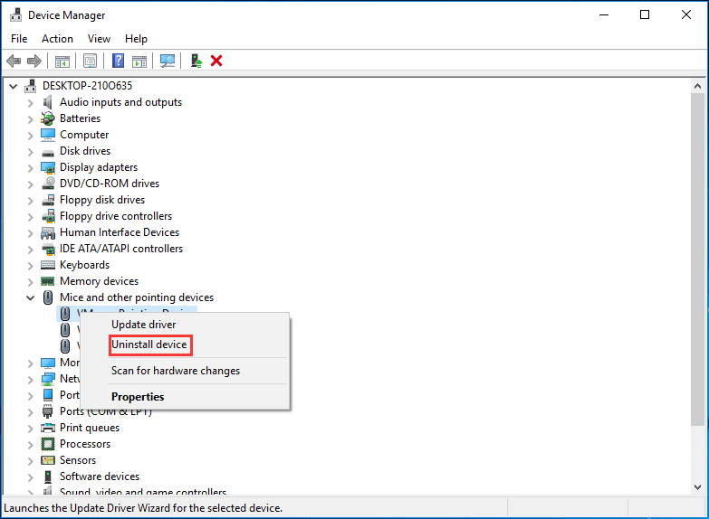 Bước 2: Mở rộng mục Mice and other pointing devices. Nhấp chuột phải vào driver chuột, rồi chọn Uninstall device.