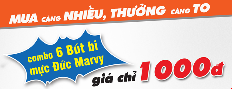 Với mỗi đơn hàng từ 290.000đ tại website Bookbuy.vn (không bao gồm các phí khác như ép plastic, vận chuyển,…) khách hàng có thể mua thêm bộ 6 cây viết Marvy mực Đức với giá chỉ 1.000đ. Bên cạnh đó là hàng ngàn BBxu cho các đơn hàng từ 139.000đ.