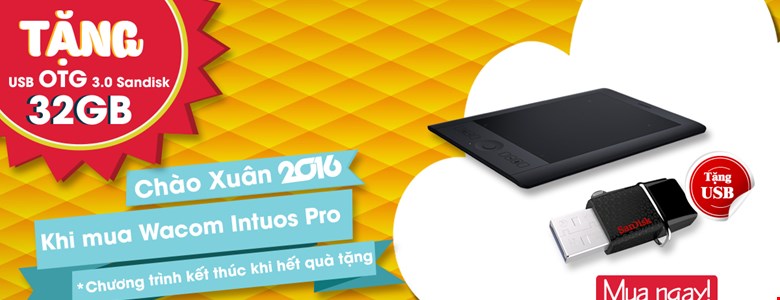 Từ 15/1 khi mua bảng vẽ Intuos Wacom Pro, bạn sẽ được tặng ngay 1 USB OTG 3.0 Sandisk 32GB trị giá 300k hoac 16GB trị giá 200k (áp dụng cho Intuos Pro Small). Chương trinh kéo dài đến khi hết quà tặng kèm. Sản phẩm được hỗ trợ giao hàng miễn phí tận nơi trên toan quốc.