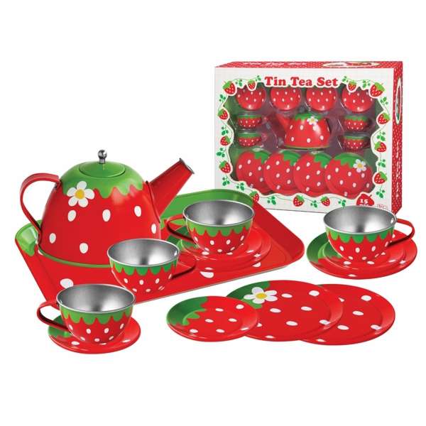 - Bộ gồm 1 ấm trà có nắp, 4 chiếc tách, 4 chiếc đĩa lớn, 4 chiếc đĩa nhỏ và 1 khay đựng được trang trí họa tiết dâu tây thật xinh xắn, tạo cho bé sự thích thú và hứng khởi khi chơi.