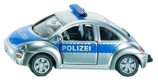 Mô hình xe cảnh sát mini của SIKU với vỏ bọc kim loại và bánh xe bằng nhựa với viền màu xanh và đèn báo hiệu màu xanh của xe cảnh sát Đức, cửa hai bên có thể mở ra được.
